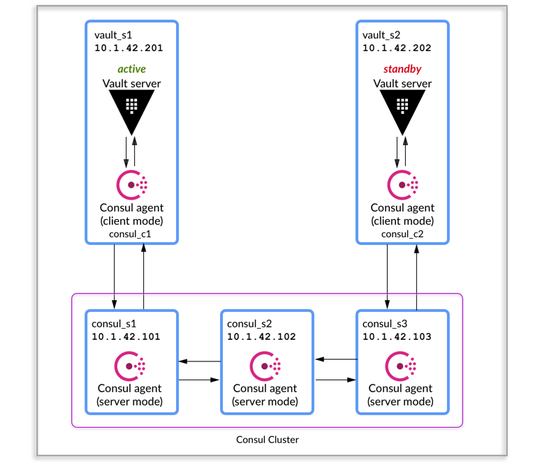 Vault Reference Architecture 문서에서 권장하는 클러스터 아키텍처를 설명합니다. Vault HA 클러스터를 프로비저닝하기 위한 Terraform 모듈이 vault-guides 레포지토리에 있습니다.